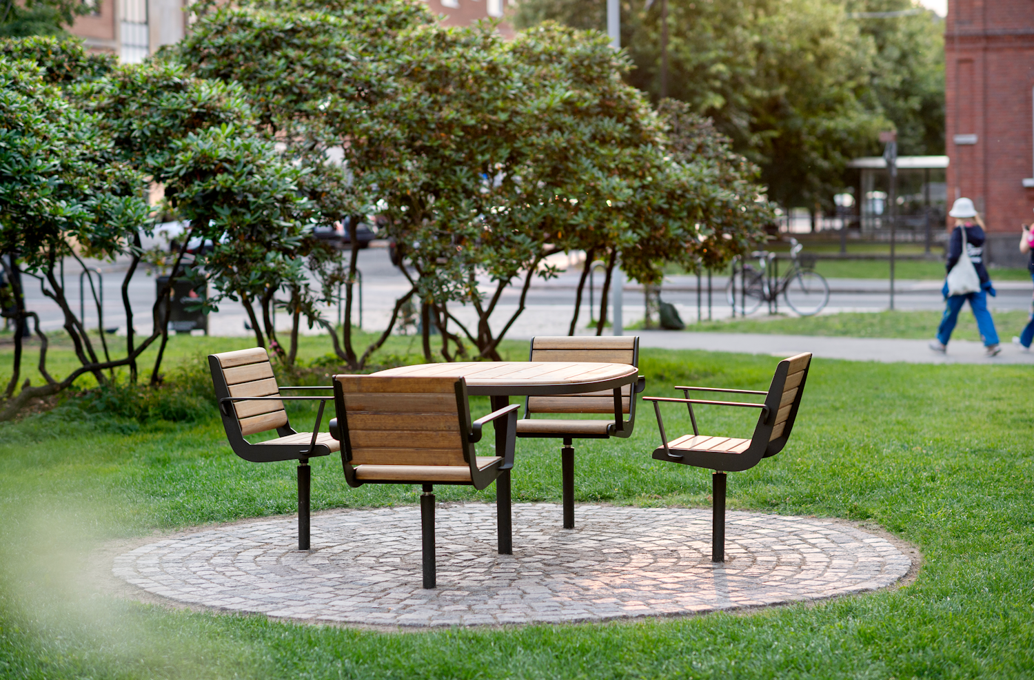 Arkad lamébord och karmstolar har fått en central roll på Väster i Jönköping, där Lasarettsparken fått en rejäl ansiktslyftning under året. Karmstolarnas återgående snurrfunktion gör att möblerna alltid står snyggt och prydligt välkomnande för besökare. Färgen är RAL 6008.