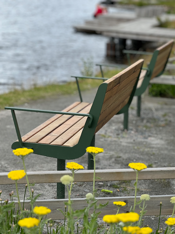 På strandpromenaden framför husen har nyanlagda gång- och cykelvägar, parkplanteringar och bryggor anlagts. Och utmed strandpromenaden bjuder Arkad soffor in till trivsamma sittplatser.