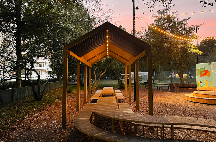 Vid Teatertorget, hjärtat i lekplatsen, står en Vårasrkuv pergola i sadeltak i tre sektioner. Två av sektionerna har fått väderskyddande plåttak och i den tredje sektionen släpps solljuset in genom den vackra takspaljén. Ljuslisten i nockbalken möjliggör kalas och picknick även när höstmörkret faller. Färgen är RAL1024 eller Halm som vi kallar den.